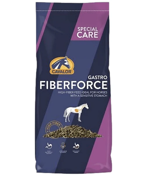 Cavalor FiberForce Gastro is een muesli met een hoog vezelgehalte voor paarden met een gevoelige maag. Het bevat een hoog aandeel vezels om de speekselproductie te stimuleren en maagzuur te neutraliseren. Paarden met maagproblemen verliezen vaak hun eetlust omdat eten pijnlijk is. Bevat een mix van luzerne- en timotheepellets, bietenpulp en 8% timotheestengels die zacht zijn voor de maagwand. Daarnaast beschermen kruiden de maagwand tegen irritatie en hebbben de buffers een bijsturende werking om de pH-waarde in de maag optimaal te houden. FiberForce Gastro is laag in suiker (4%) en zetmeel (6%). We hebben aan FiberForce Gastro fenugriek toegevoegd, dit maakt het extra smakelijk. Met extrudaten die licht verteerbaar en goed opneembaar zijn en pre- en probiotica voor een optimale darmwerking, de basis voor een natuurlijke weerstand.