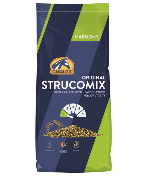 Cavalor Strucomix Original is een vezelrijke muesli voor gezonde en vitale paarden. Met lange luzerne vezels die het kauwen en darm bewegelijkheid stimuleren. Bevat pré en probiotica voor de ontwikkeling van een goede darmflora, de basis voor een natuurlijke weerstand. Geformuleerd zonder haver. Met gepofte granen voor een goede opneembaarheid en vlotte vertering. Heel smaakvolle muesli met vezel, gepofte granen en kruiden en dus geschikt voor moeilijke eters.