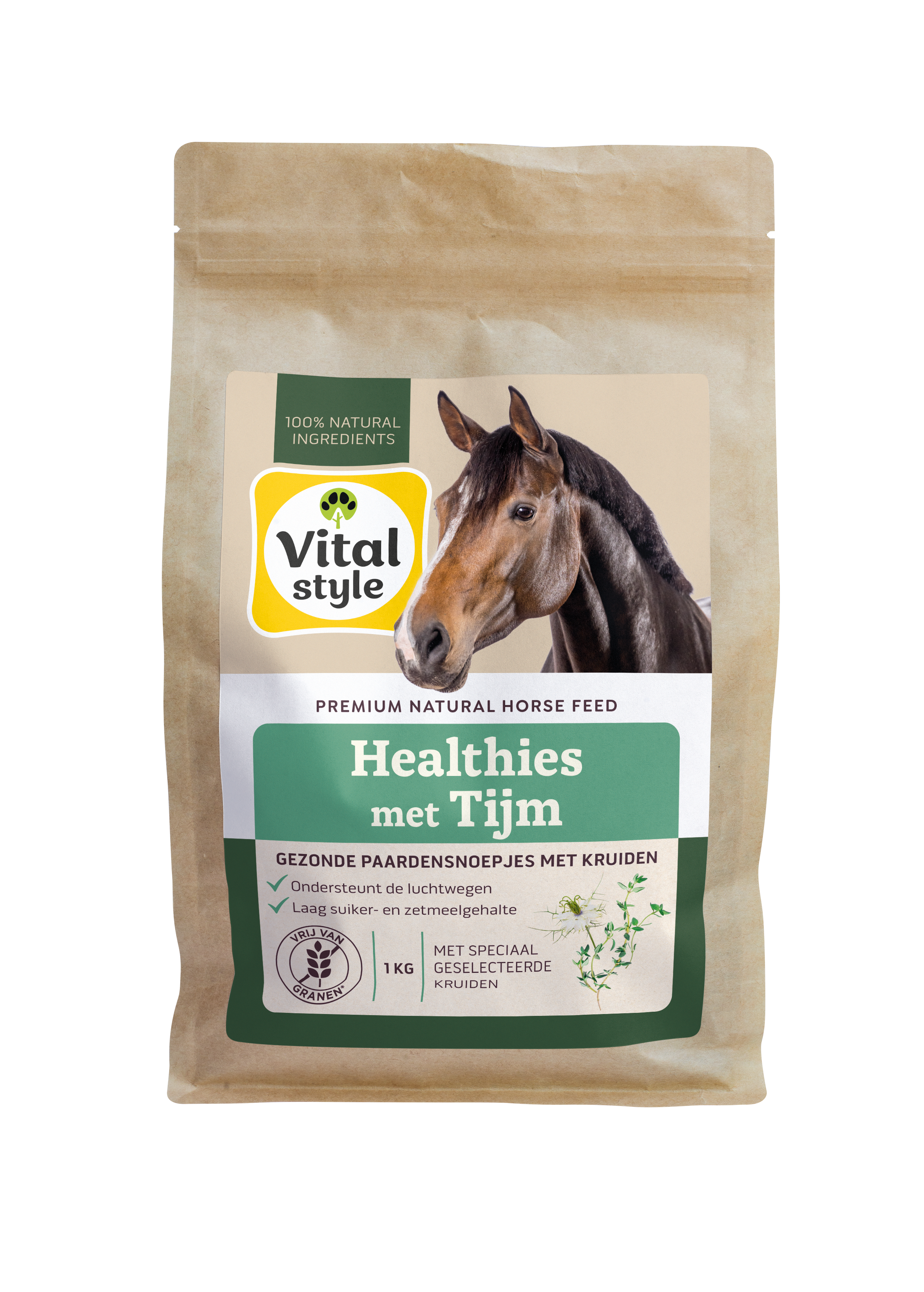 Healthies met Tijm is dé gezonde beloning voor paarden en pony’s. Dankzij de graanvrije receptuur, het lage suiker- en zetmeelgehalte en de toevoeging van specifieke kruiden zijn de paardensnoepjes geschikt voor iedere paard of pony. De kruiden in Healthies met Tijm zijn speciaal ter ondersteuning van de luchtwegen.