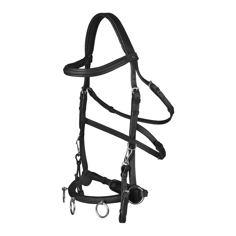 – 3 ringen op de neusriem voor het bevestigen van de longeerlijn en/of bijzetteugels