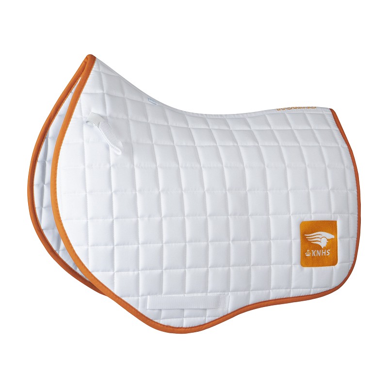 KNHS katoenen spring zadeldek met coolmax voering. Coolmax reguleert warmte en zorgt voor een optimale vochtopname. Afgewerkt met een oranje bies en KNHS badge op 1 zijde.