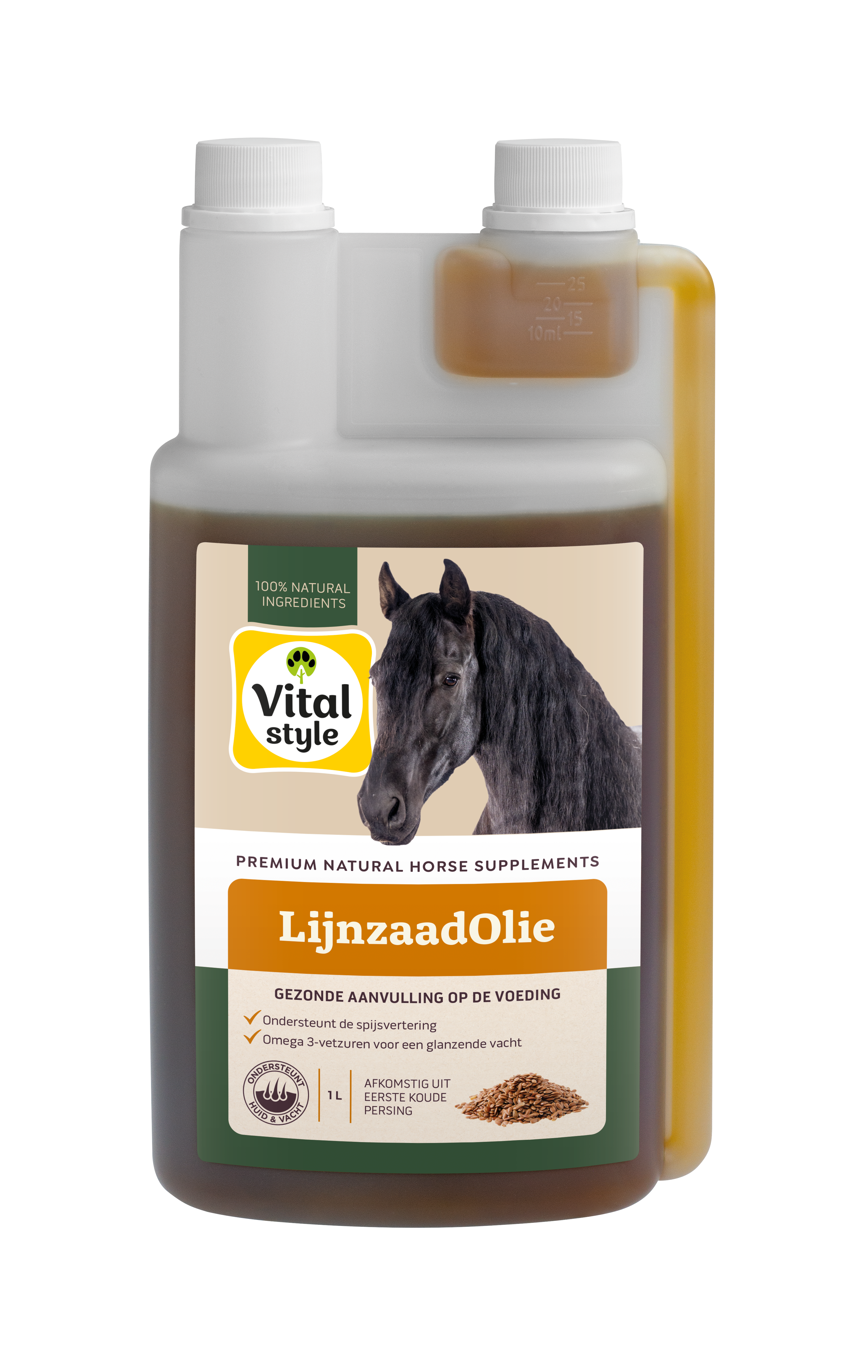 LijnzaadOlie van VITALstyle is geperst van de eerste koude persing lijnzaad zodat essentiële voedingsstoffen behouden blijven. Het is een gezonde aanvulling op de voeding, ondersteunt het behoud van een gezonde spijsvertering en ideaal als ondersteuning bij het verharen. Meer weten hoe je een paard optimaal ondersteund bij het verharen?