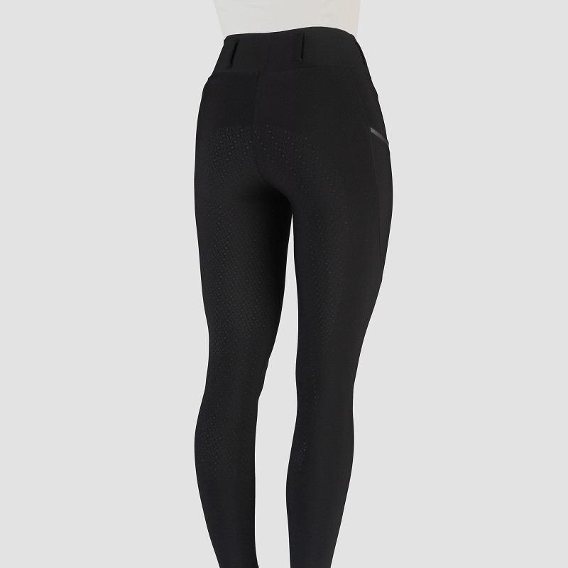 Mooi vormgegeven rijlegging uit hoogwaardige, comfortabele en ademende stretchstof. De legging heeft een flatterende pasvorm met een tailleband voorzien van riemlussen. De legging beschikt over een volledig siliconen zitvlak voor goede grip in het zadel. Ook is de legging voorzien van twee zijzakken, diep genoeg om je mobiele telefoon in op te bergen.