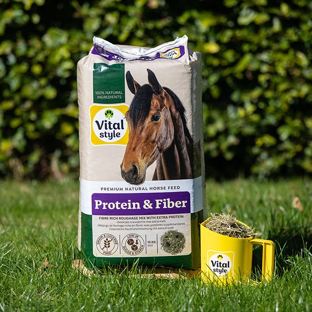 Protein & Fiber is een structuurrijke ruwvoermix als aanvulling op of gedeeltelijke vervanging van het ruwvoer. De ruwvoermix bevat een brede variatie aan grassoorten met een laag fructaangehalte en is rijk aan ingrediënten met een hoog eiwitgehalte. Het stimuleert de speekselproductie door verhoging van de kauwactiviteit. De ruwvoermix heeft een zachte structuur, korte vezels en bevat een toevoeging van eiwitrijke ingrediënten zoals lupinevlokken en lijnzaadschilfers. Protein & Fiber is geschikt voor paarden met een hoge eiwitbehoefte, zoals sportpaarden, jonge paarden in de groei en paarden die moeilijk op gewicht blijven. Protein & Fiber bevat gezonde omega 3-vetzuren uit lijnzaadolie en goed verteerbare vezels voor een goede darmwerking. Protein & Fiber is vrij van toegevoegde vitaminen en mineralen. Zo kun je niet overdoseren en kan het goed met een balancer zoals Oerbalans Vitalstyle gecombineerd worden. Protein & Fiber heeft een laag suiker- en zetmeelgehalte en is vrij van luzerne, melasse en granen.